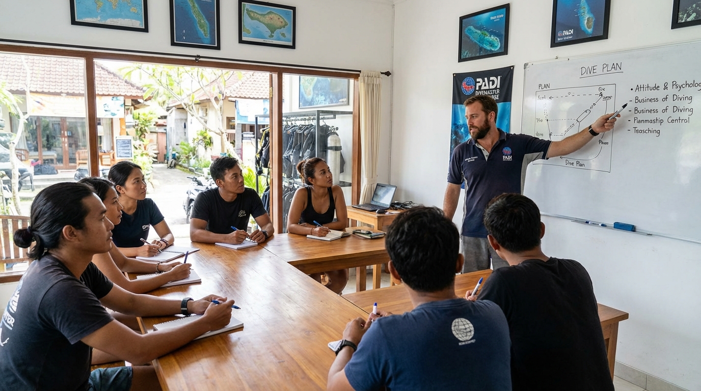 If you’re searching for PADI Divemaster Course Bali, here’s how the course usually runs. Finish the knowledge part first so your Bali time stays fun and in-water.