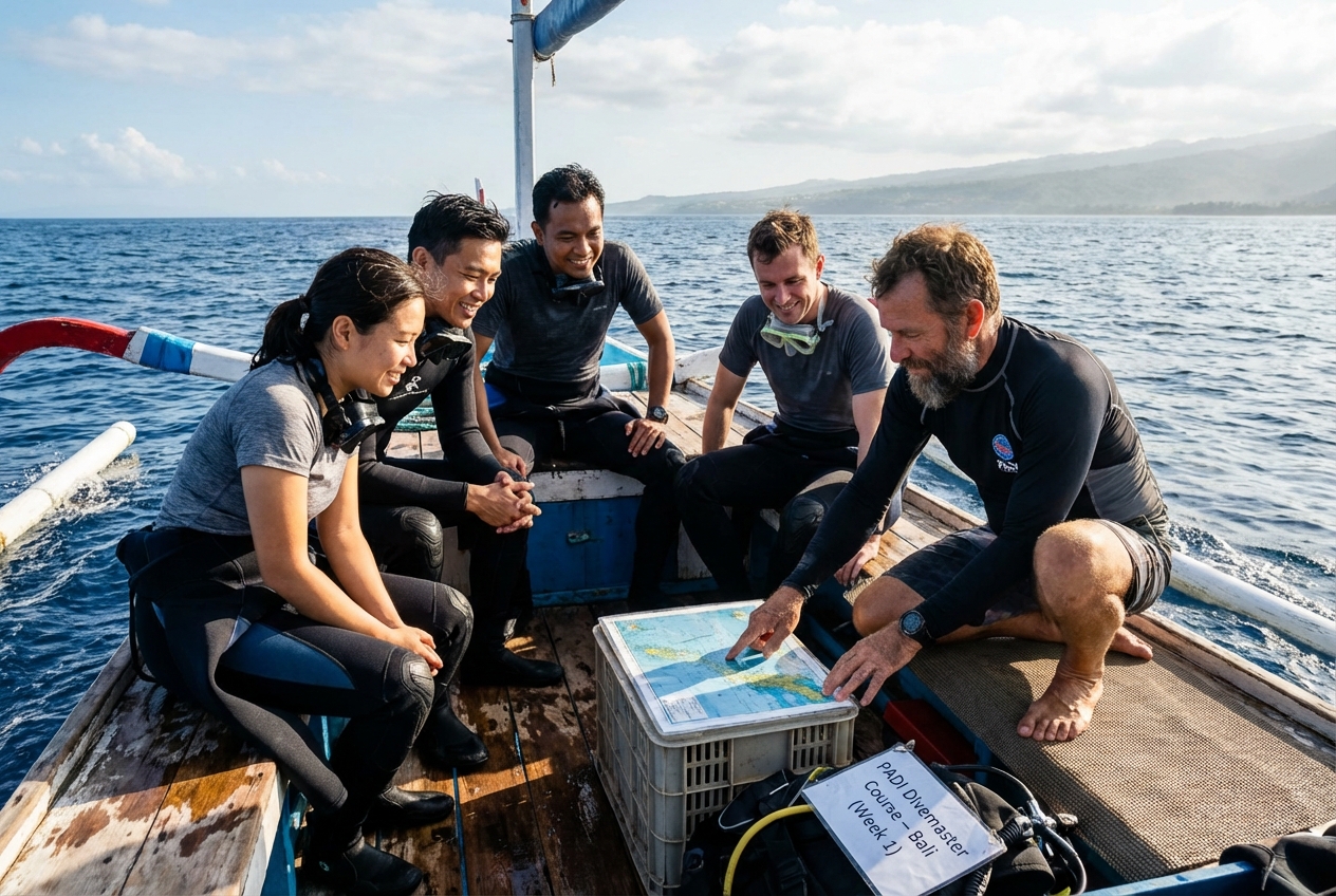 You will map dive sites, lead guided tours, and help manage student safety—key parts of the padi divemaster bali and pro diver training bali.