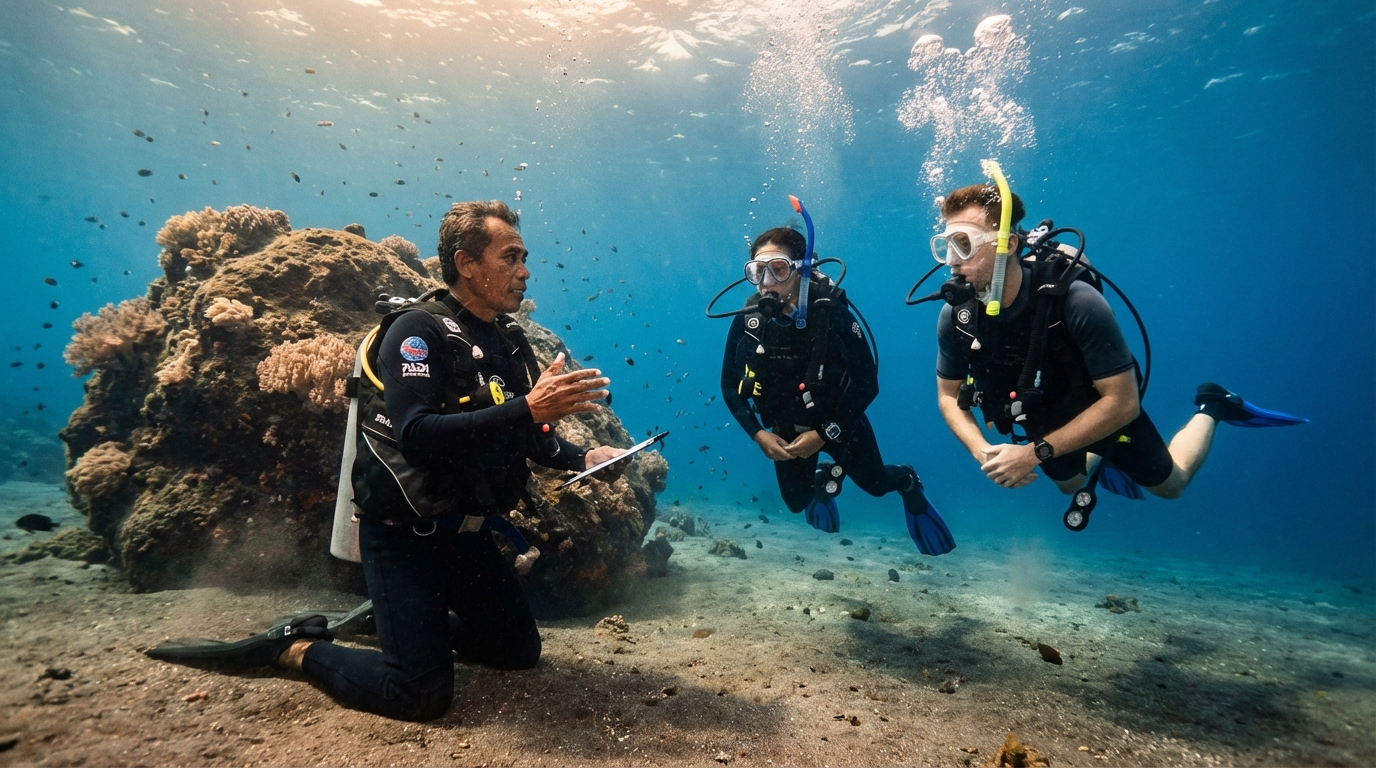 PADI Divemaster in Tulamben, Bali. Go pro—build leadership, guiding skills, and real dive experience to start your diving career.
