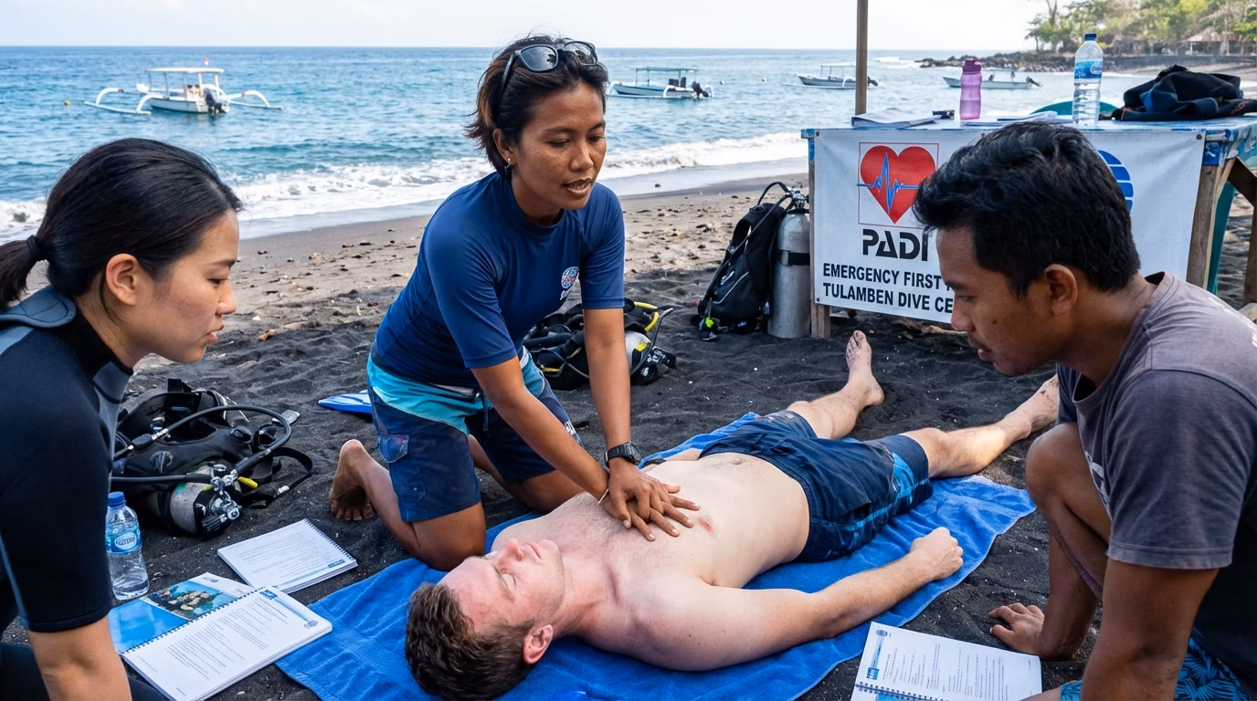 PADI Emergency First Response in Tulamben, Bali. Learn CPR & first aid with hands-on practice—ideal for divers and everyday safety.