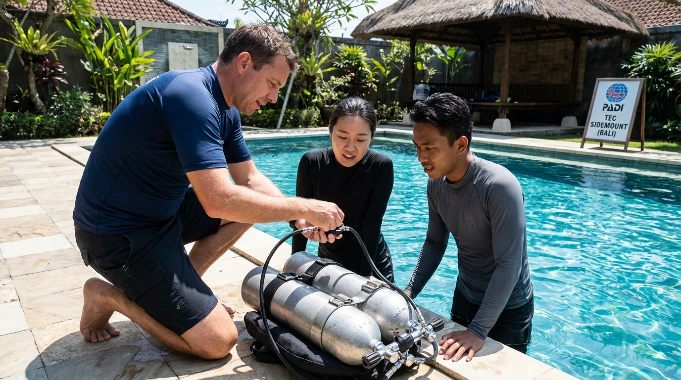 PADI Tec Sidemount in Tulamben, Bali. Tec sidemount training—configure gear, refine trim, and build procedures for technical progression.