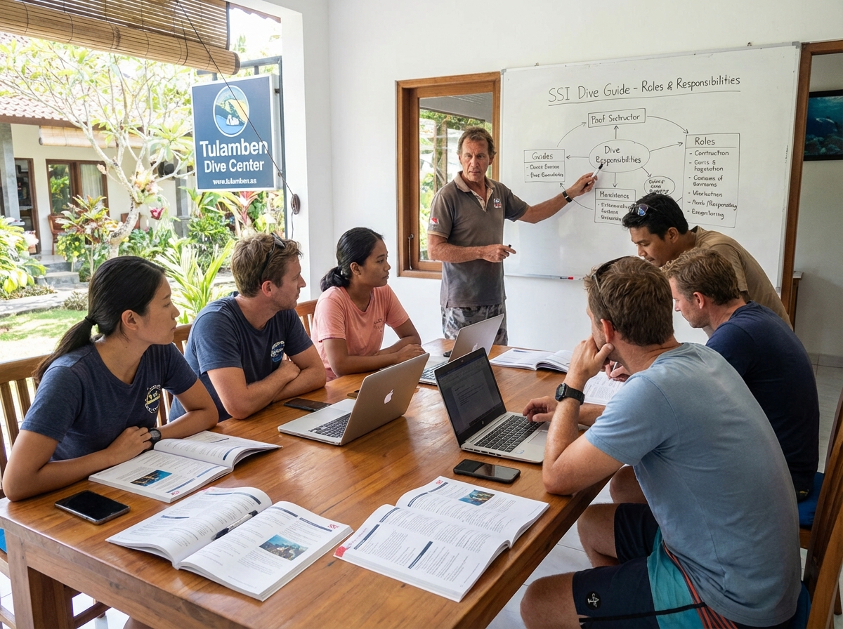 You are responsible for site briefings, navigation, and diver safety. The ssi dive guide course bali prepares you for these professional dive training bali tasks.