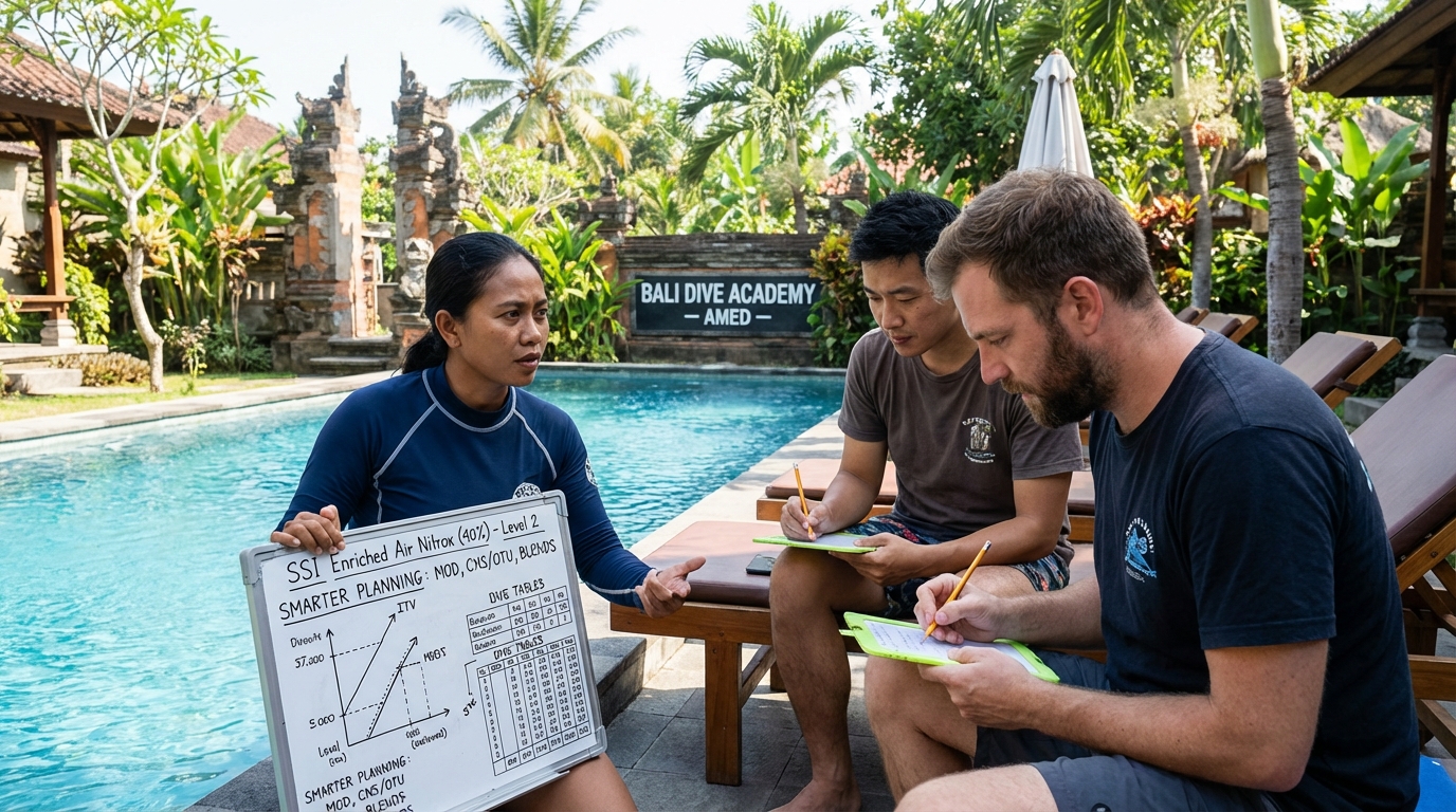 SSI Enriched Air Nitrox Level 2 (40%) Specialty in Tulamben, Bali. Learn nitrox up to 40%—longer no-deco time, smarter planning, and safer…